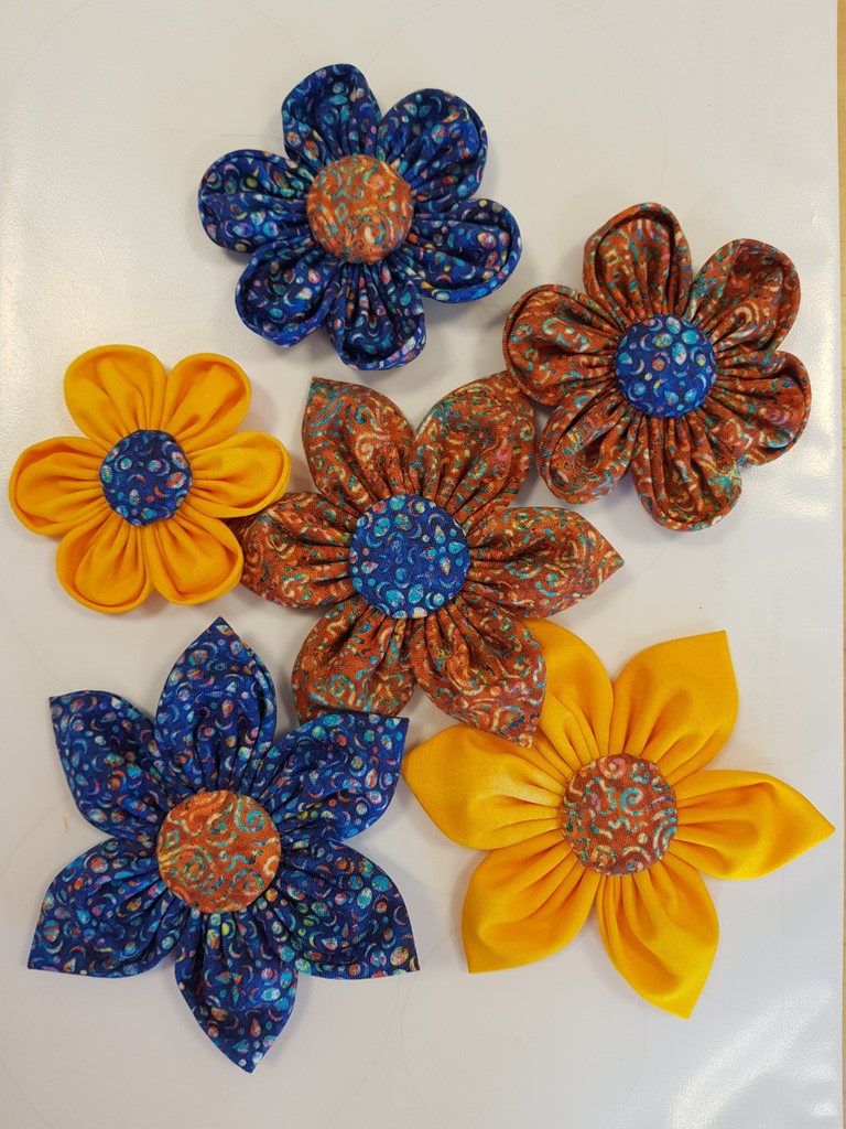 Ces fleurs sont obtenues par un pliage particulier du tissu. Elles peuvent ensuite être montées en broche, en barrette, en déco et si elles sont plusieurs et de tailles différentes vous pouvez obtenir un collier. Votre imagination vous permettra de trouver d'autres utilisations.