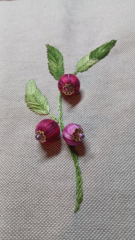 Nous habillerons des perles avec des perles, du fil et du ruban afin d'obtenir des baies que nous poserons sur un tissu brodé de feuilles.