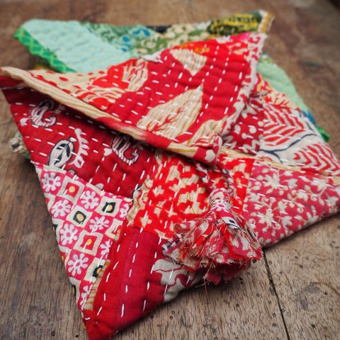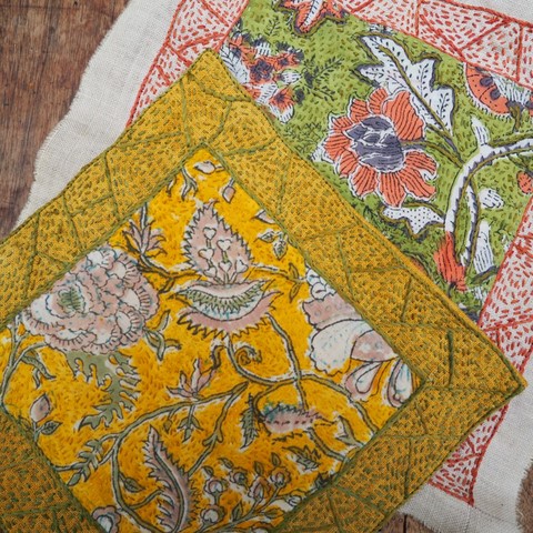 Réalisation d’une pochette en Kawandi, technique de matelassage/broderie originaire d’Inde. Nous réaliserons une pochette multi-usage à partir de saris de coton recyclés qui seront assemblés, matelassés et brodés dans la tradition Kawandi. Broderie au fil de soie.